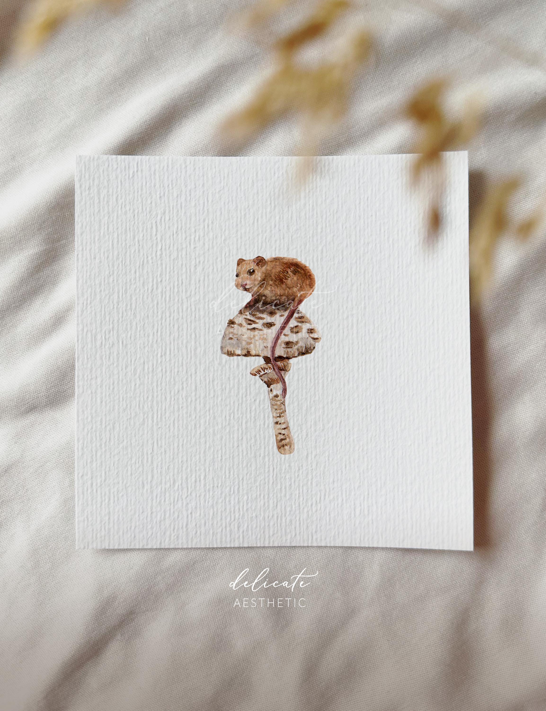 Little Explorer: Field Mouse in Mushroom Paradise | Miniature Art Print | Print from my Original Watercolor | DelicateAesthetic