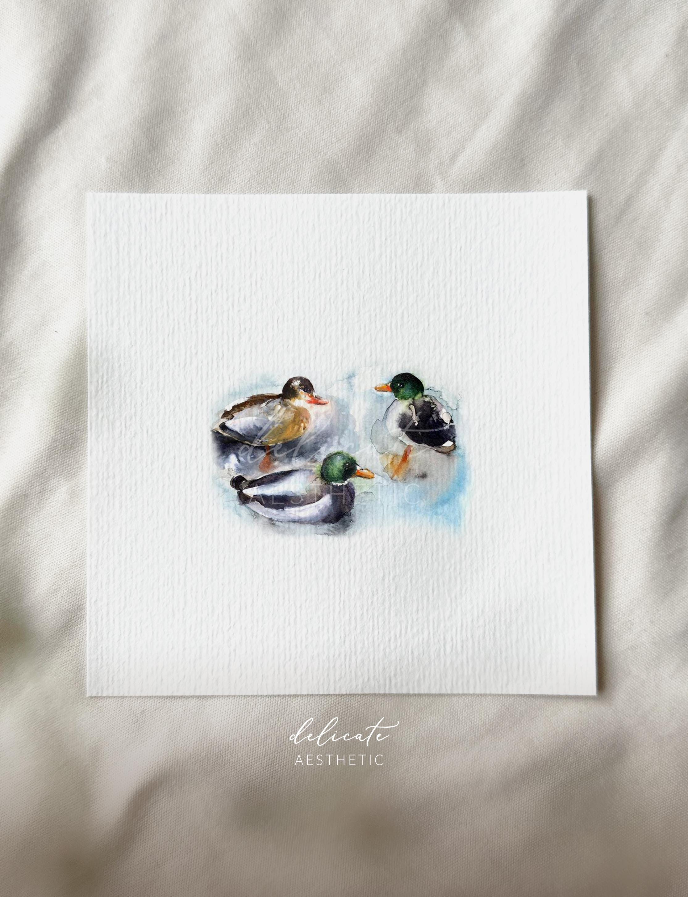 Duck trio on a calm sea - miniature art print - print from my original watercolor | DelicateAesthetic