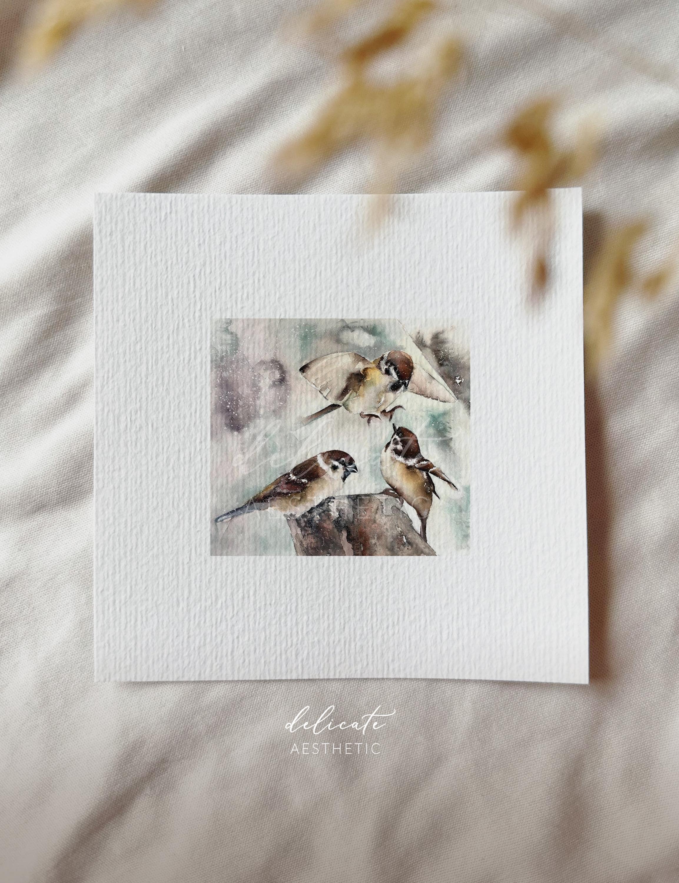 Out and about in the forest: Sparrows - Miniature art print - Print from my original watercolor | DelicateAesthetic